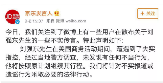 刘强东在美国商务活动期间,遭到了失实指控,经过当地警方调查没发现有任何不当行为。