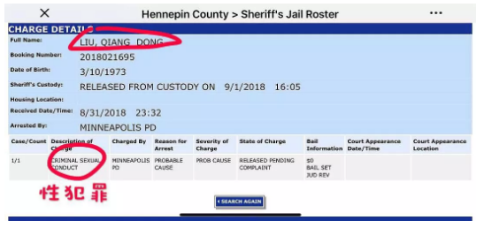 根据在明尼苏达州的警方逮捕记录里显示,刘强东涉嫌性犯罪,正在取保等待正式指控。