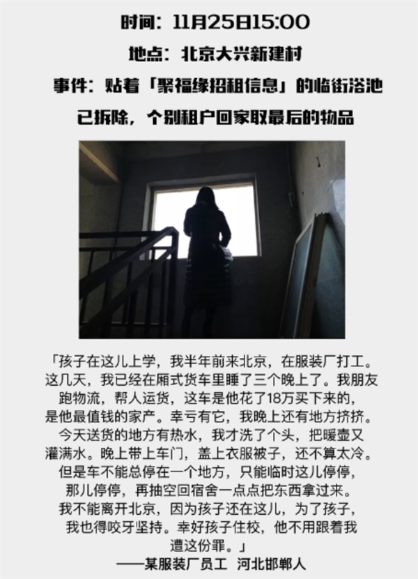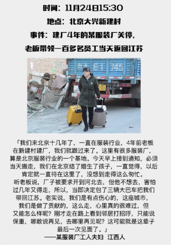 因为大兴的一场火灾事故,北京这个神奇的首都,开始了大规模的外来人口整治,拉开了在京漂泊和拼搏的打工一族的大迁移序幕!