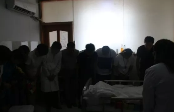 6岁的儿子跪在遗体前,