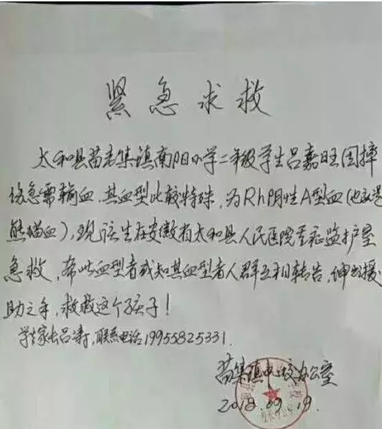 太和县苗老集镇南阳小学二年级学生吕嘉旺因摔伤急需输血,其血型比较特殊,为Rh阴性A型血(也就是熊猫血),现该学生在太和县人民医院重症监护室急救,希望此血型者或知其血型者人群互相转告,伸出援助之手,救救这个孩子!