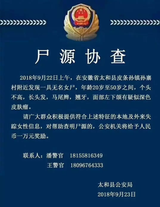 2018年9月22日上午,在安徽省太和县皮条孙镇孙寨村发现一具无名女尸,年龄20-50岁之间,个头不高,长头发,马尾辫,翘牙,面部左下颌有疑似深色皮肤瘤。