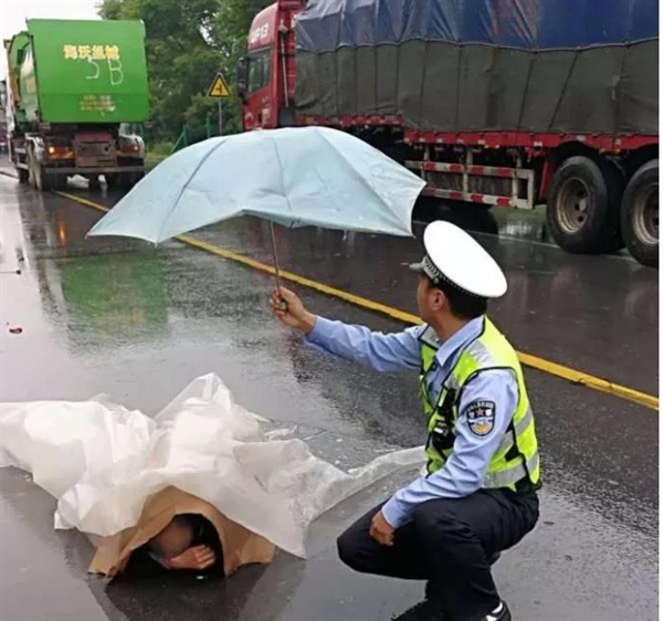【文明随手拍】给伤者打伞阜阳警察小哥哥,给你个东西你要吗?