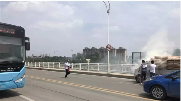 6月10号下午1点30分左右,北京路立交桥上,一辆货车货物突然起火!,货车后方行驶的市民刘红军,赶紧提醒货车司机停下进行扑救,并迅速拿出后备箱的灭火器。
