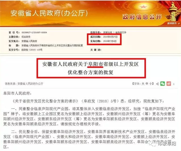 7月4日,安徽省人民政府网站公布了《安徽省人民政府关于阜阳市省级以上开发区优化整合方案的批复》、《安徽省人民政府关于六安市省级以上开发区优化整合方案的批复》。