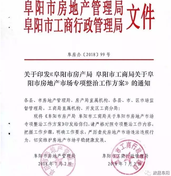 7月6日,阜阳市房地产管理局在单位官网发布关于印发《阜阳市房产局 阜阳市工商局关于阜阳市房地产市场专项整治工作方案》的通知。