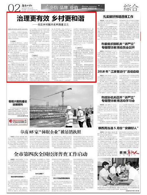乡村振兴,治理有效是基础。农业大市的阜阳,近年来强化基层农村的有效治理,为实现乡村产业兴旺、生态宜居、乡风文明和生活富裕奠定了良好基础。
