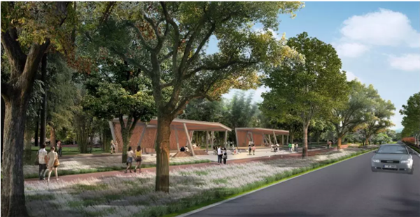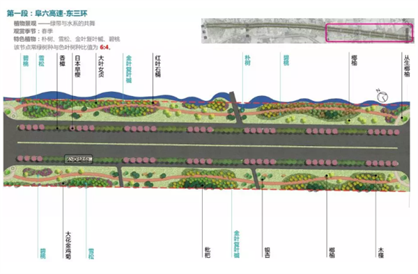 第一段为济广高速——东三环段,将打造绿带与水系共舞的植物景观带,将以树形开展的朴树作为主要特色树种,搭配以常色叶及春花植物,下层以片植的草花为主,营造大气舒展的植物景观;