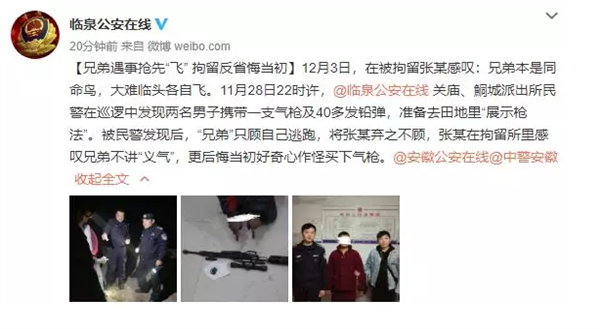 近日临泉关庙、鮦城派出所民警在巡逻中发现两名男子携带一支气枪及40多发铅弹准备去田地里“展示枪法”被民警发现后,“兄弟”只顾自己逃跑将张某弃之不顾事后张某在拘留所里感叹兄弟不讲“义气”兄弟本是同命鸟,