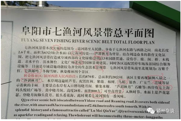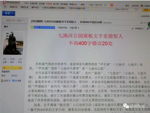 今日浏览《阜阳新闻网》,在爆料板块看到署名“神羊”的一篇题为“七渔河公园展板文字差错惊人,不到400字错误20处”的帖文。发表时间为 2018年9月24日上午09:24 分。读完此文,深感震