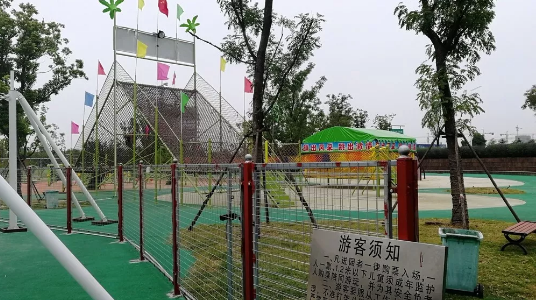 这是位于阜城双清湾公园西北侧的儿童游乐场,这片区域有沙池、滑梯、攀爬网等设施。现在又新增了蹦床、秋千架、环道自行车等。但近期不少逛双清湾的市民发现,这里不知何时改名为“体能乐园”。最关键的是,这里原本